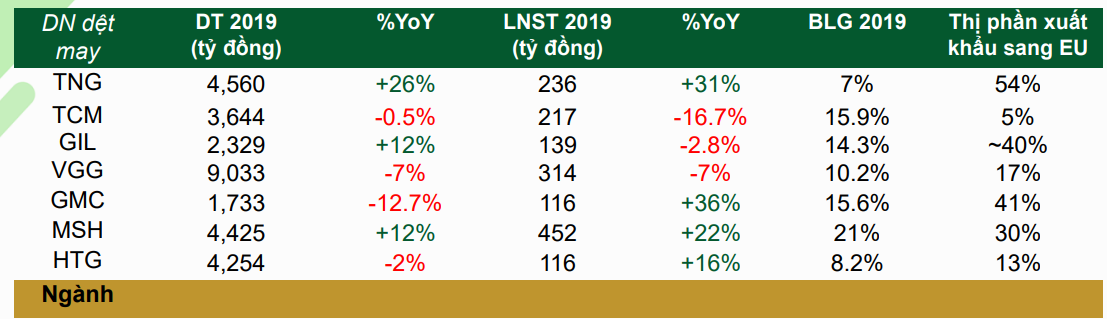 Các doanh nghiệp có thị phần lớn xuất khẩu sang EU (>30% thị phần) và tự chủ nguyên vật liệu đầu vào như TNG kỳ vọng sẽ được hưởng lợi sau khi EVFTA dự kiến có hiệu lực vào T7/2020.